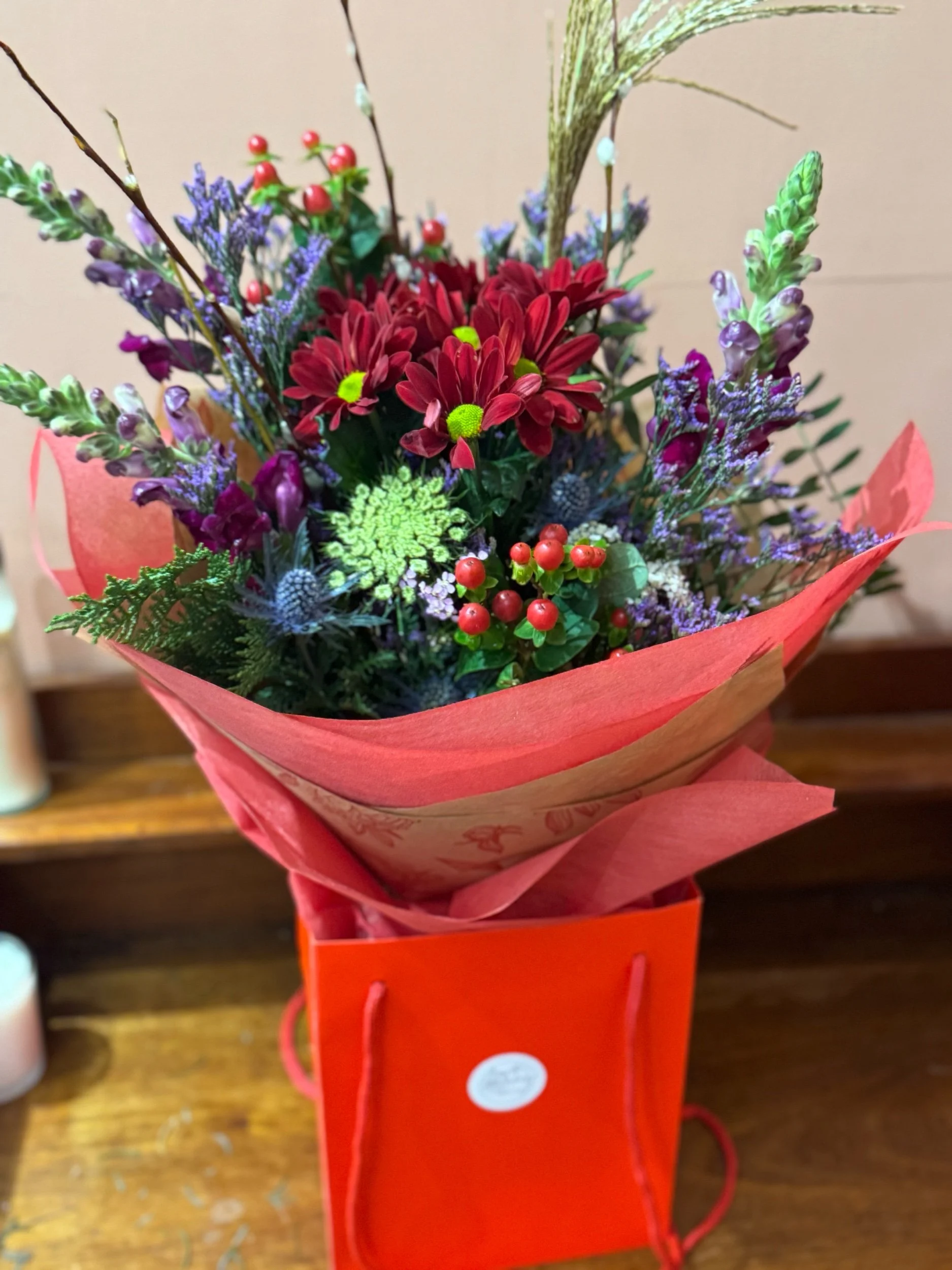 Beautifully festive collection of flowers and foliage complete with berries, Christmas scents and long lasting flowers and in water. Decorate your home to welcome in Christmas or give as a gift to someone special.